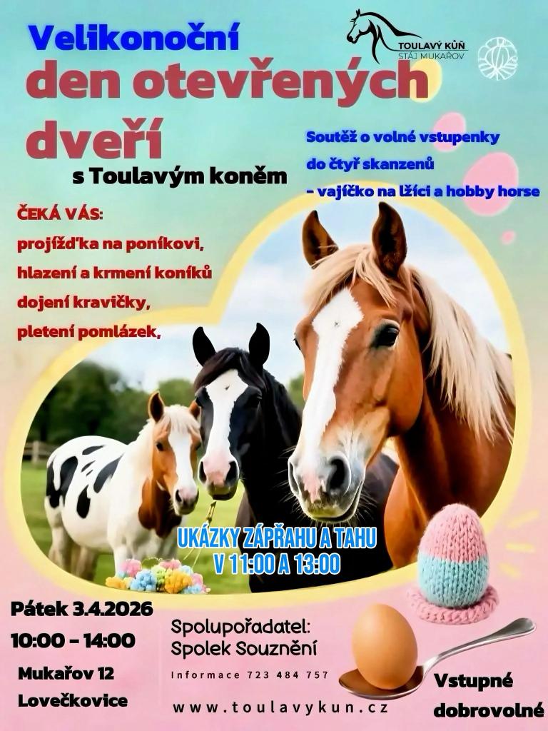 V pátek 3. dubna 2026 se v Mukařově koná akce s Toulavým koněm. Návštěvníci se mohou těšit na soutěž o volné vstupenky do čtyř skanzenů a zábavné aktivity jako je závod s vajíčkem na lžíci a hobby horse. Akce probíhá od 10:00 do 14:00 a vstupné je dobrovolné. Pro více informací kontaktujte organizátory na telefonním čísle 723 484 757.